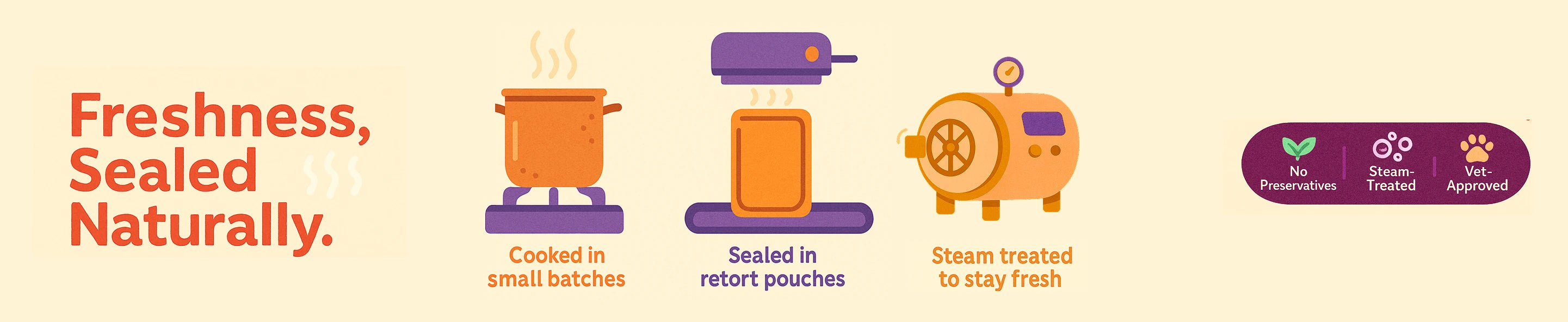 No pellets, no junk. Real ingredients, gently cooked and sealed.Vet-Approved