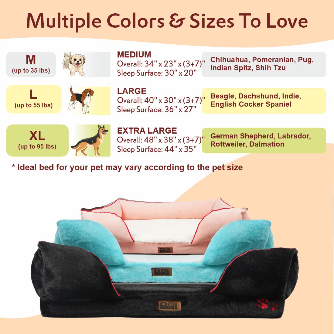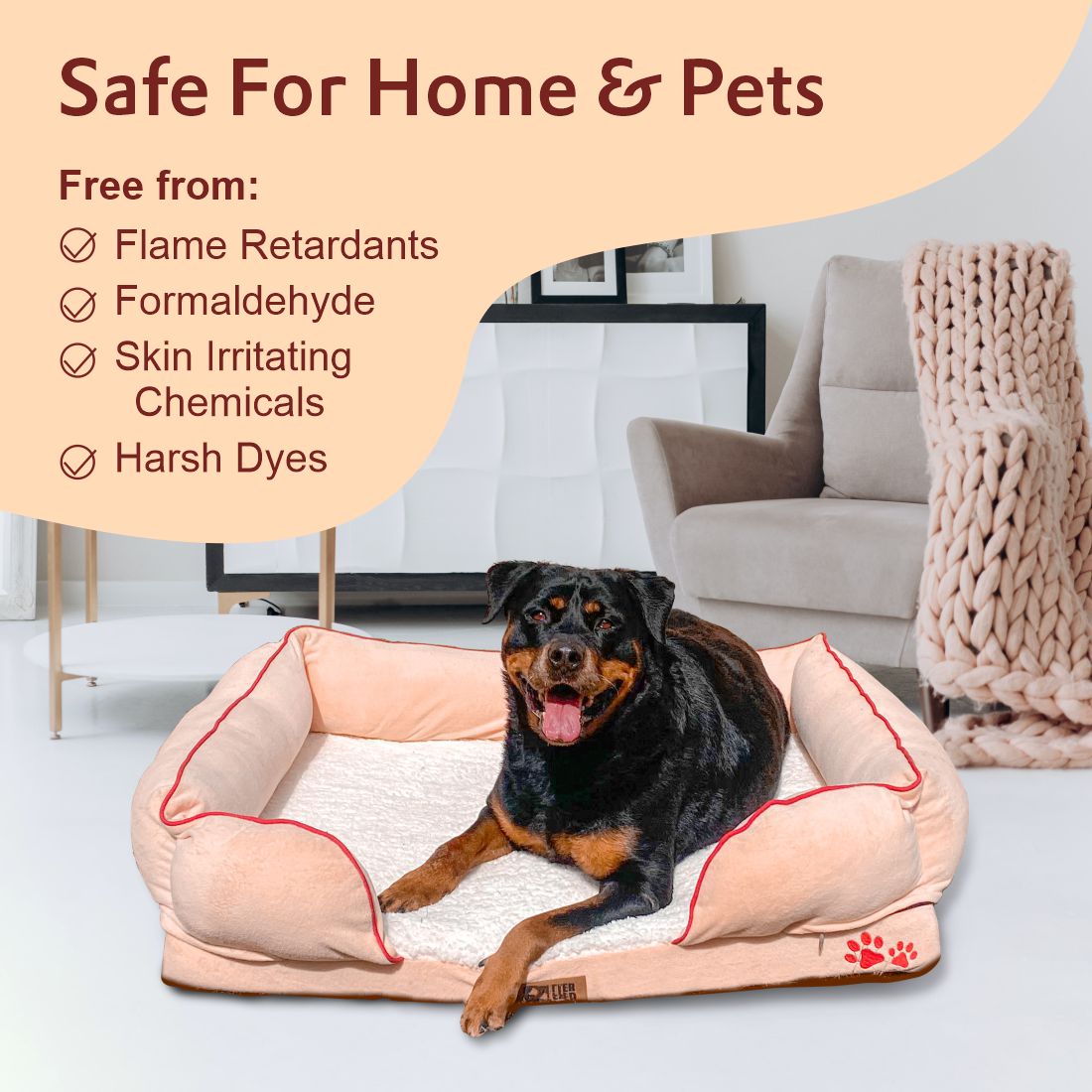 Our comfortable and stylish Orthopedic Sofa Beds are a classic addition to your Pet wardrobe. Made from soft micro fur fabric on the sides and soft Sherpa cushion on top, this bed is soft, roomy and at the same time strong & sturdy. Orthopedic Convoluted Foam base at the bottom provides the perfect support to the spine, which your pet deserves. It is a luxuriously comfortable bed with padded perimeter that provides support and comfort for restful sleep or lounging. It is great for pets of all ages & breeds, and comes available in multiple colors and sizes, so you can select the right bed that suits your home décor as well. Gift your pet a comfortable resting time with our Luxury Orthopedic Sofa Pet Bed.