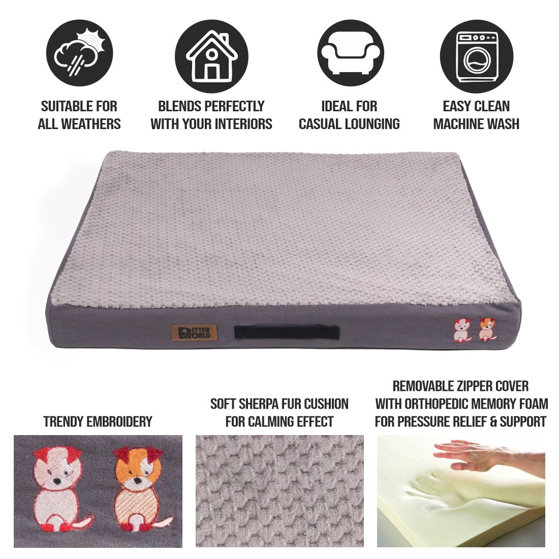 Our Mattress Beds are made in contrasting colors that blend with modern home interiors. The anti skid bottom does not let it slip and offers a strong grip in both wet and dry conditions. The top cover is replaceable and machine washable. Help create a better world for your pets! Our products are specially crafted with one goal in mind, seeing your pet at its very best. With a wide variety of offerings designed to keep animals healthy, happy and energized, Petter World stands out as the brand that truly puts your pet first.