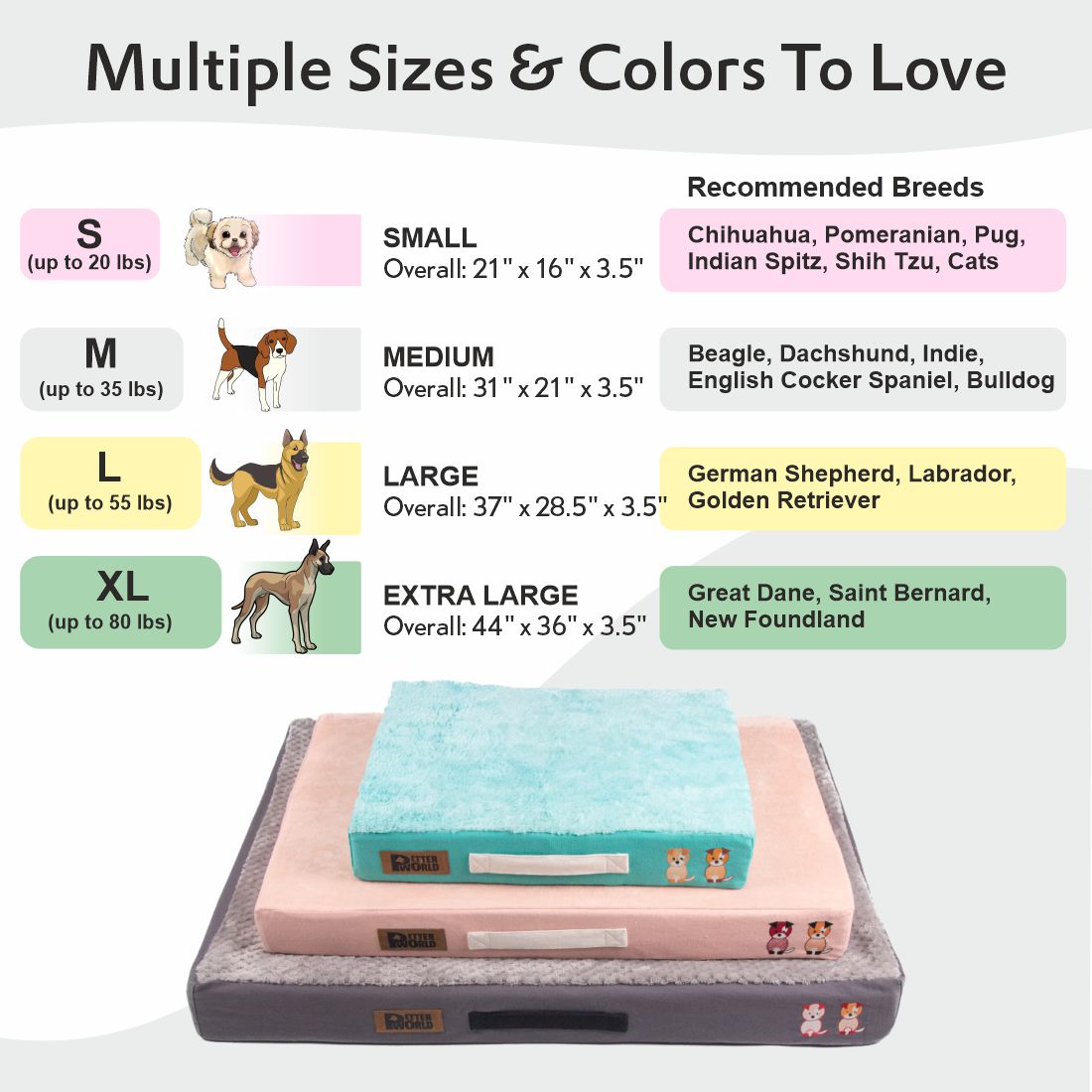 - PETTER LIVING - Finally, your furry friend can stretch, curl up, and rest comfortably all on one bed; Thick, quality-assured foam & fiber inserts and soft outer fabrics make Petter World beds the only option for dog & cats of all breeds & sizes.