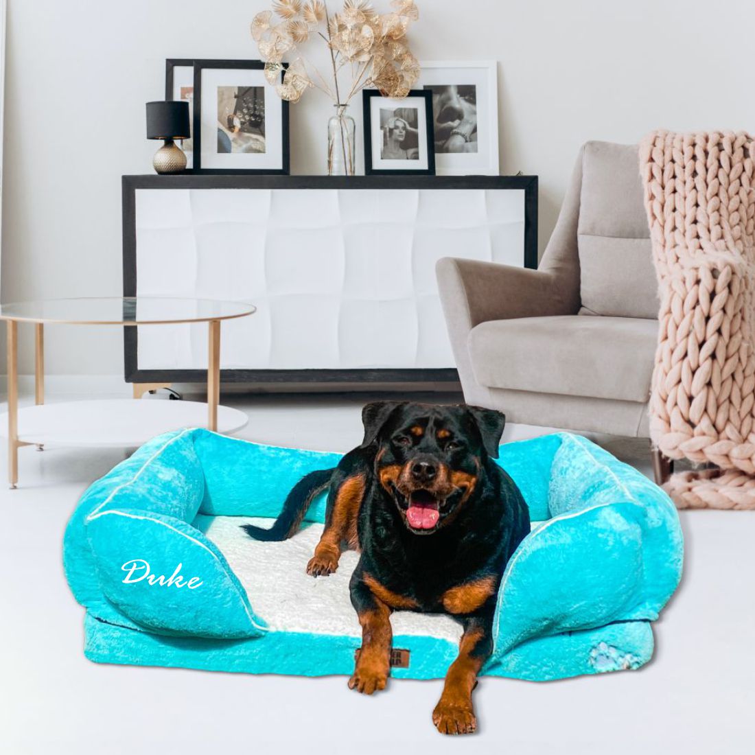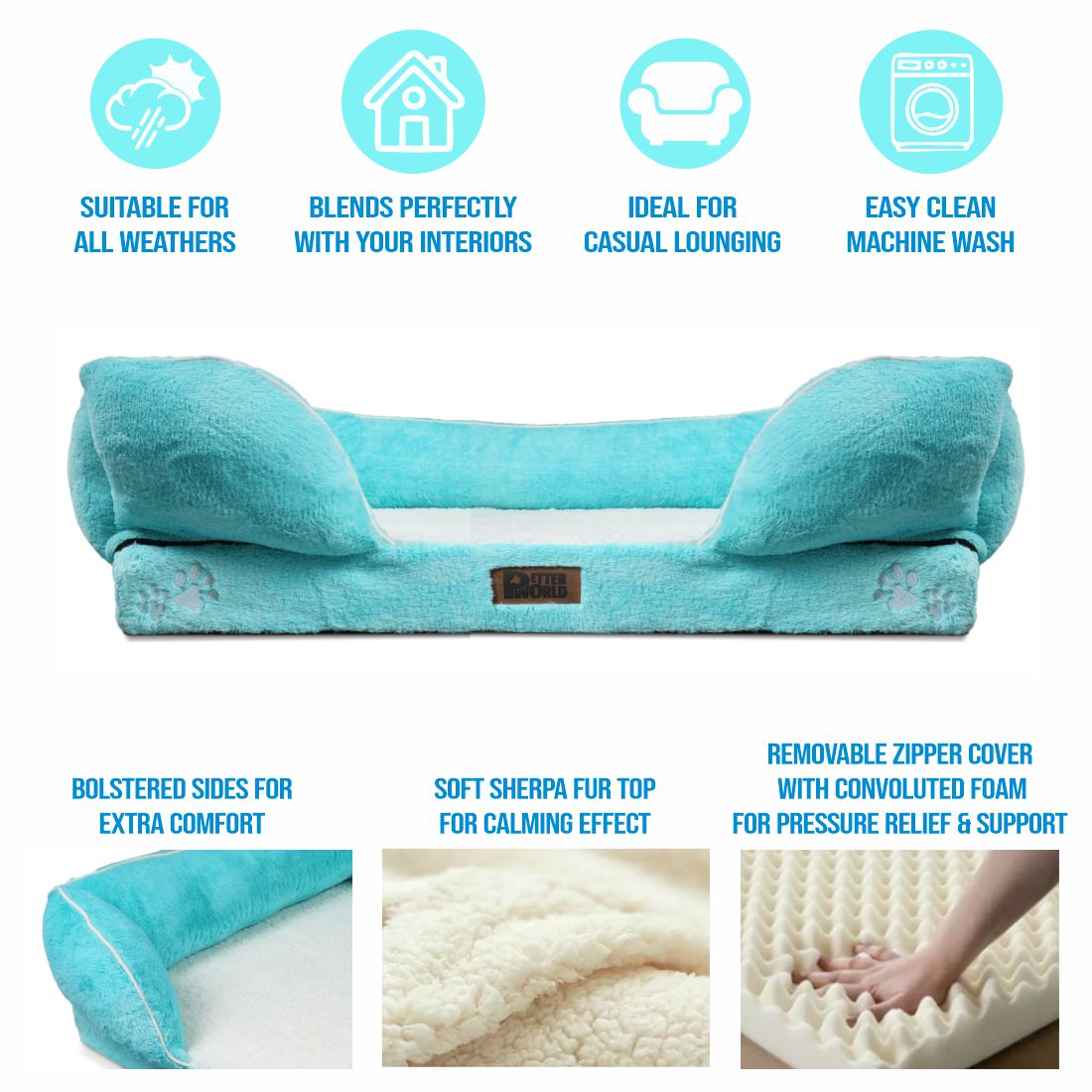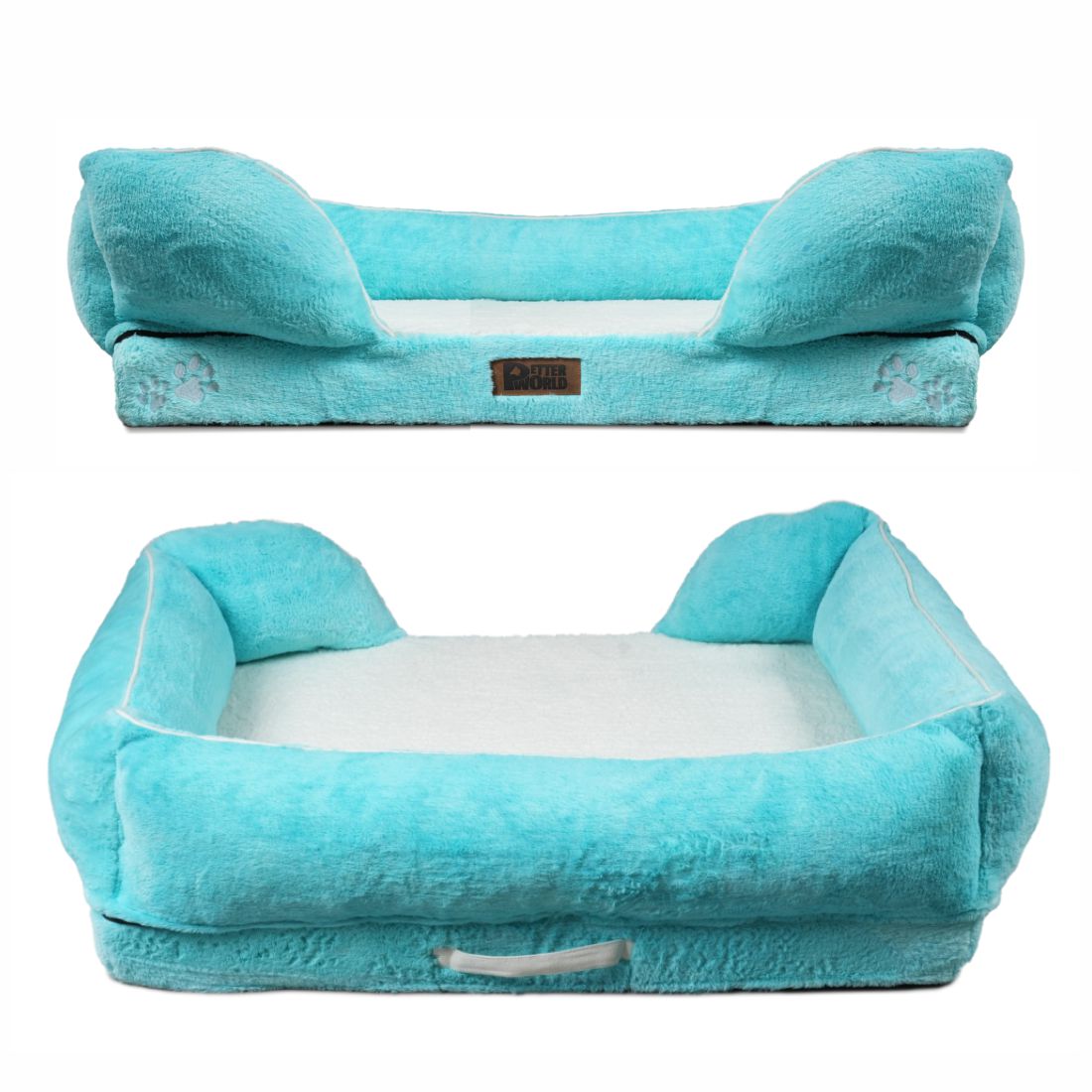 Petter World All weather Ultra Luxury Micro Fur Orthopedic Sofa Bed with Sherpa fur cushion top and convoluted foam base for pressure relief and calming effect, Turquoise: