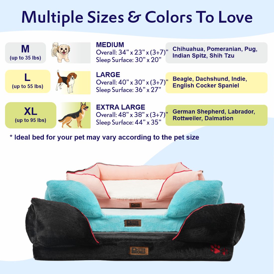 Our comfortable and stylish Orthopedic Sofa Beds are a classic addition to your Pet wardrobe. Made from soft micro fur fabric on the sides and soft Sherpa cushion on top, this bed is soft, roomy and at the same time strong & sturdy. Orthopedic Convoluted Foam base at the bottom provides the perfect support to the spine, which your pet deserves. It is a luxuriously comfortable bed with padded perimeter that provides support and comfort for restful sleep or lounging. It is great for pets of all ages & breeds, and comes available in multiple colors and sizes, so you can select the right bed that suits your home décor as well. Gift your pet a comfortable resting time with our Luxury Orthopedic Sofa Pet Bed.